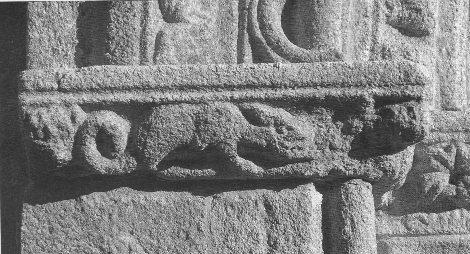 dereito da portada principal da igrexa de Santa María do Azougue, que amosa un modelo moi semellante tanto no propio animal como na decoración vexetal que complementa dita imposta.